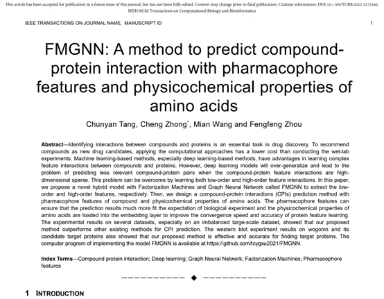 近日,公司教师唐春艳工程师、钟诚教授、广西老员工命科学与技术公司王勉副教授、吉林大学计算机公司周丰丰教授的研究论文“FMGNN: A method to predict compound protein interaction with pharmacophore features and physicochemical properties of amino acids”被IEEE/ACM Transactions on Computational Biology and Bioinformatics期刊录用,且已经在线发表(DOI: 10.1109/TCBB.2022.3172340)。IEEE/ACM Transactions on Computational Biology and Bioinformatics是中国计算机学会CCF推荐的综合交叉学科生物信息计算领域顶级期刊。