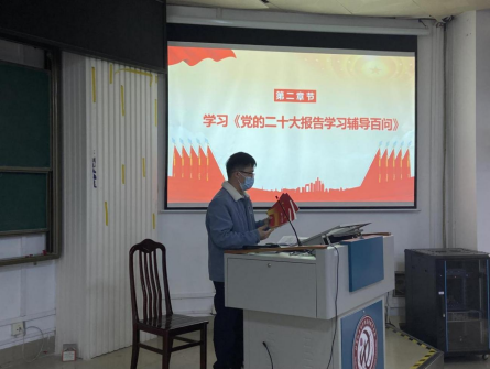 首先,潘秋宇同志结合《党的二十大报告学习辅导百问》、《党的二十大党章修正案学习问答》、《党的二十大学习笔记本》、《党的二十大文件汇编》等书籍,带领全体党员同志深入学习贯彻党的二十大精神。全体党员同志深入学习领会习近平总书记在学习贯彻党的二十大精神研讨班开班式上的重要讲话精神。