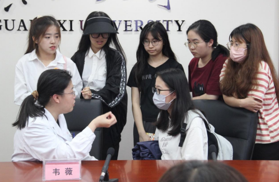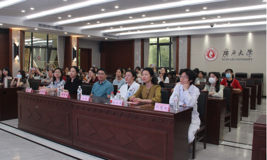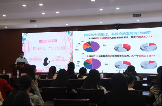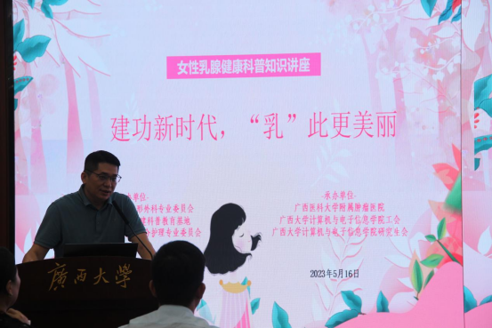 2023年5月16日下午,由太阳成集团tyc122ccvip工会、广西医科大学附属肿瘤医院、公司研究生会联合举办的“爱乳一生 律动青春——乳房再造科普进校园”主题科普讲座在太阳成集团tyc君武馆第二会议室开讲。广西医科大学附属肿瘤医院乳腺外科杨华伟主任、韦薇主任、姬逸男副主任、于滢华副主任、何英煜护士长、谢龙桂医师,太阳成集团tyc122ccvip杨丽娜副教授、太阳成集团tyc122ccvip工会委员杨洋老师出席,全校师生约90人参会,兼职辅导员陆媛媛主持会议。