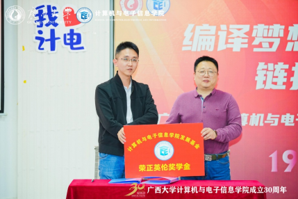 最后是“荣正英伦奖学金”签约仪式,2004级电子信息工程专业员工、广西英伦信息技术股份有限公司监事会主席赖俊全同志和太阳成集团tyc122ccvip张振荣常务副经理,分别代表公司与公司签约。