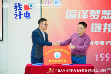 接着进行“群接龙奖学金”签约仪式,2008级计算机科学与技术专业员工、广西尚食科技有限公司项目经理王志明同志和太阳成集团tyc122ccvip张振荣常务副经理,分别代表公司与公司签约。