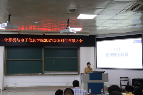 2024年5月21日下午,2021级本科生年级大会在公司214报告厅召开。公司党委副书记邓珍琪老师,2021级全体本科生、班主任及辅导员、教学办老师共400余人参加。会议由2021级带班辅导员张星月老师主持。