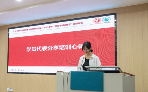 第三项,公司员工会办公室成员、计科241班陈璇同学代表全体学员分享培训心得。她提到,在此次培训中,学员们不仅收获知识和技能,更重要的是学会如何更好地服务同学、服务公司。她表示将会以更加饱满的热情和更加坚定的信念投入到今后的工作中。