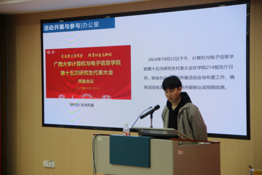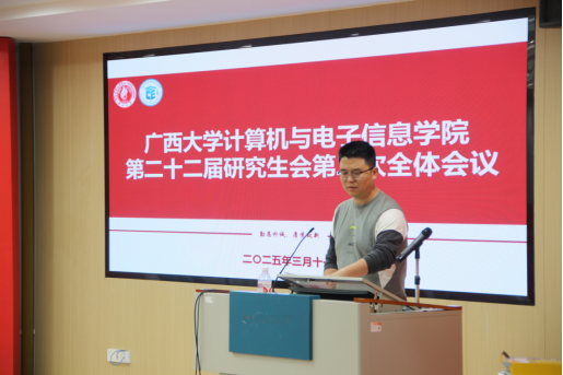 研究生会执行主席史承悦同学对上学期研究生会的工作开展情况进行总结,并对下一阶段研究生会的工作提出具体的设想和要求。