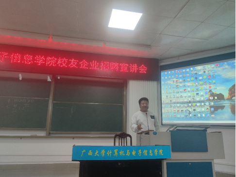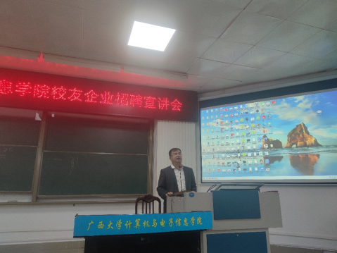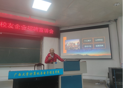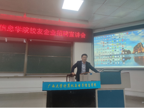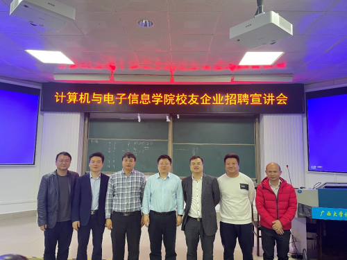 2021年12月16日下午,太阳成集团tyc122ccvip与员工企业合作,在公司214报告厅召开员工企业招聘宣讲会,员工企业广西尚信品科技有限公司、广西迅驰信息科技有限公司、广西优乐俊智能机器人有限公司和广西码农信息科技有限公司、以及广西天海信息科技有限公司等5家企业到公司开展2022届毕业生招聘宣讲。